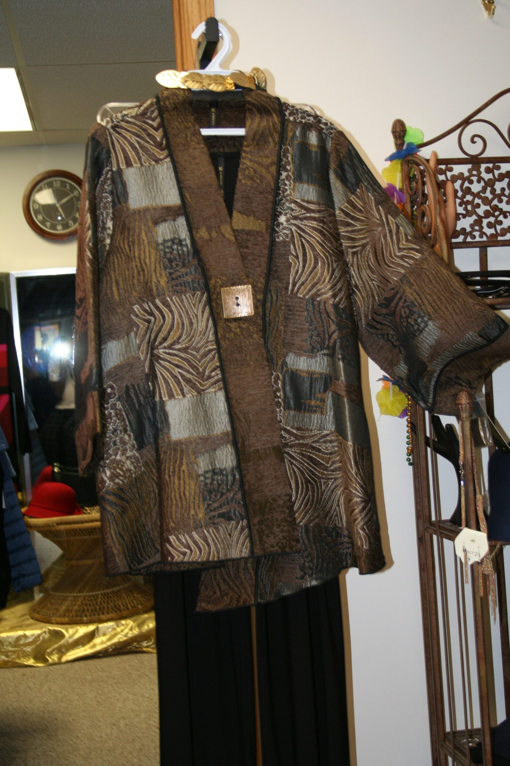 A very dramatic piece of the season. Elaborate patterns of brocade, poly and rayon. In rich colors of brown, gray, black and a one button fastner. Stands out one button fastner. Stands out over black or brown latering.