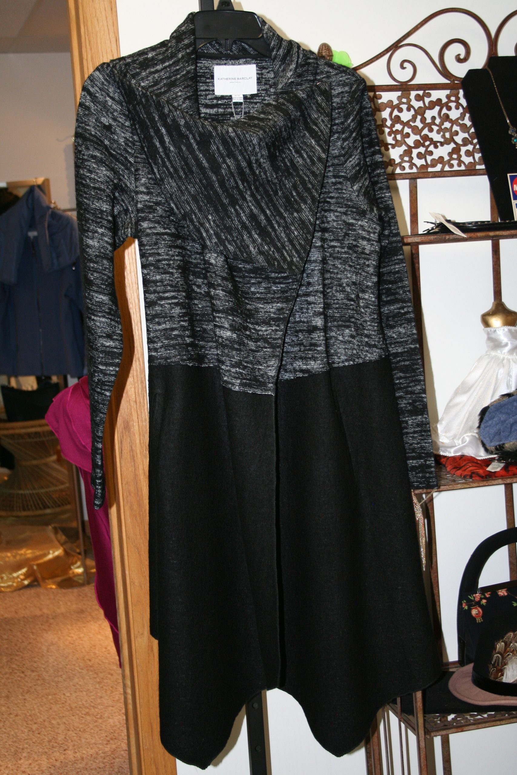 Finely etched geometric patterns gracefully flow in hues of black, grey and white. The collar makes its own scarf. The slim fit at the waist flares and flows into a wrap dress. Very unique in rayon and acrylic. A definite show stopper.