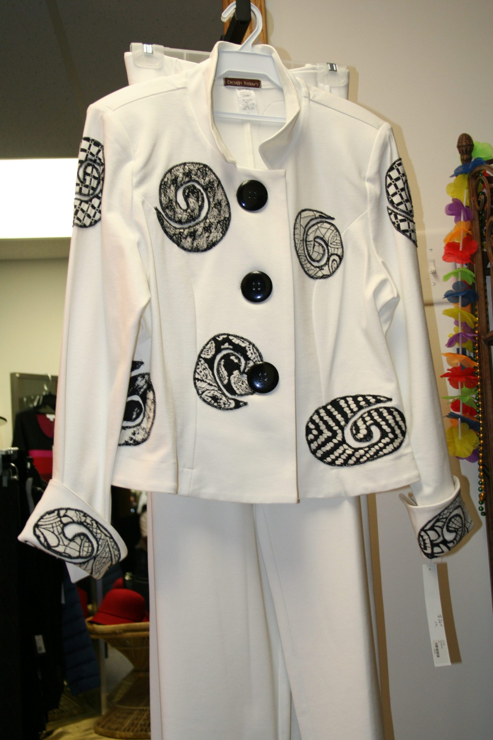 Our youthful cut. Acetate with a touch of spandex. A true beauty in black with white trim around the adjustable double collar and cuffs. Comes with a matching skirt or pant in black. Also beautiful with a white slack.