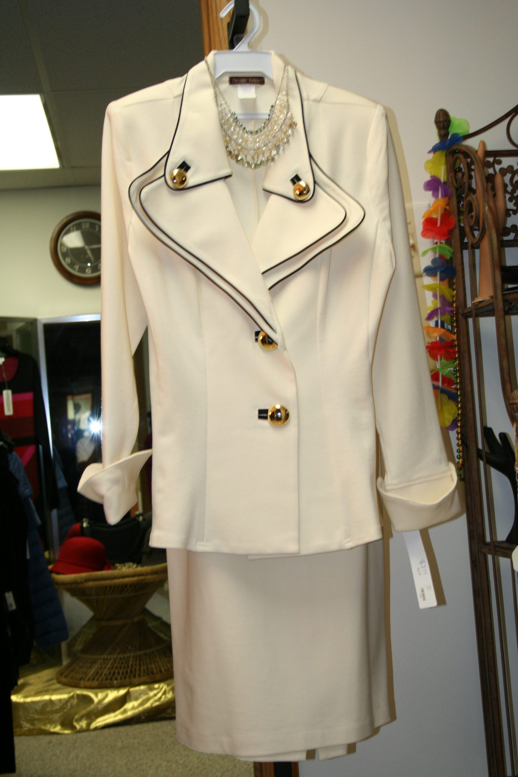 Our youthful cut. Acetate with a touch of spandex. A true beauty in black with white trim around the adjustable double collar and cuffs. Comes with a matching skirt or pant in black. Also beautiful with a white slack.