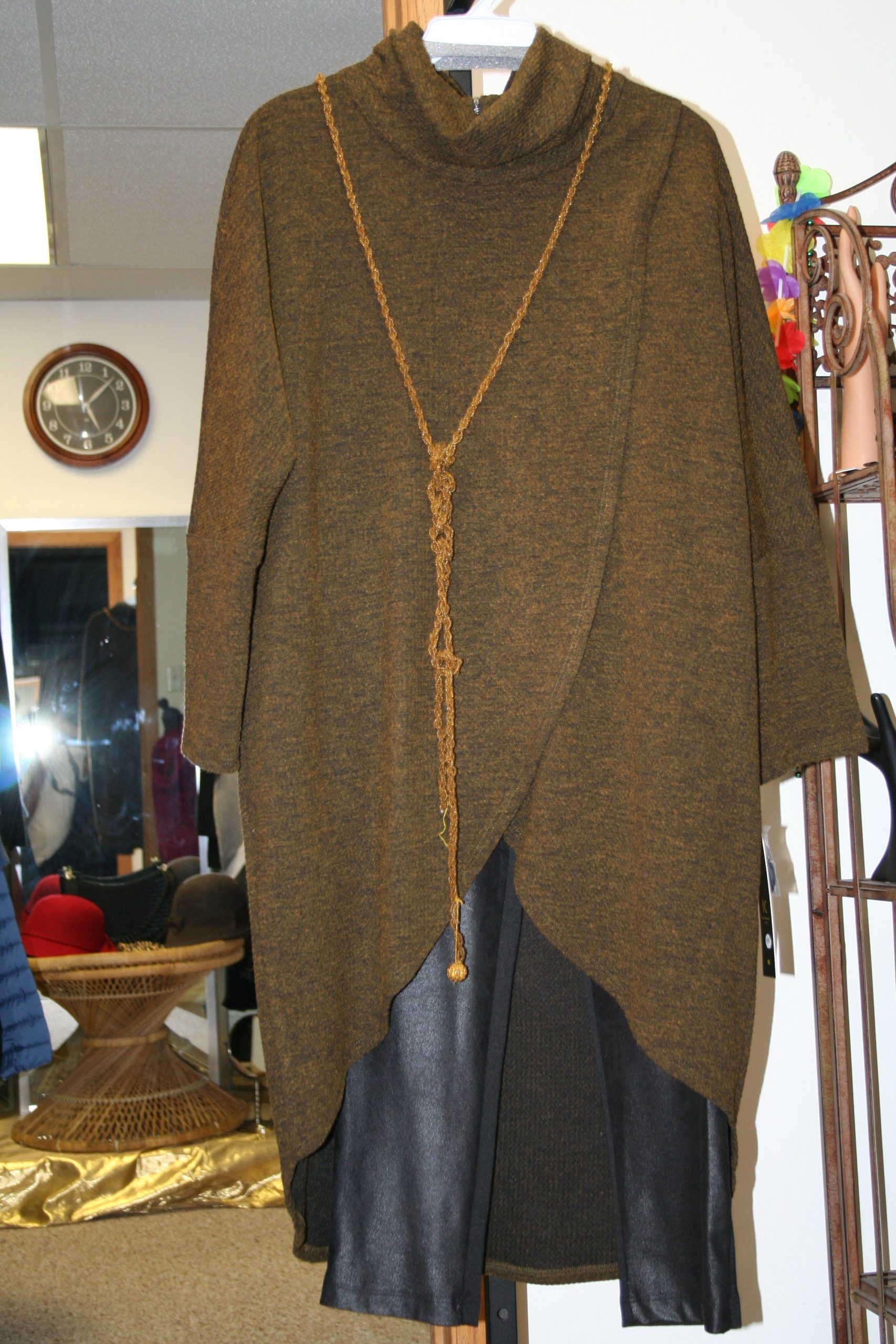 Downtown chic with jeans or leggings or uptown with a skirt. Our slim split sweater features a turtle collar in olive/brown. Finely tailored light weight but also warm.
