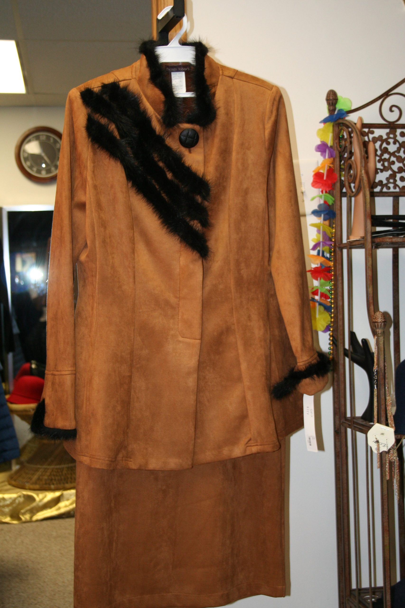 Autumn and winter’s coziest suit, soft and snuggly in ultra suede. Tailored in mocha/carmel with black faux piping around the collar, the sleeve and about the bodice. The matching skirt brings up the rear, plain yet a perfect fit.