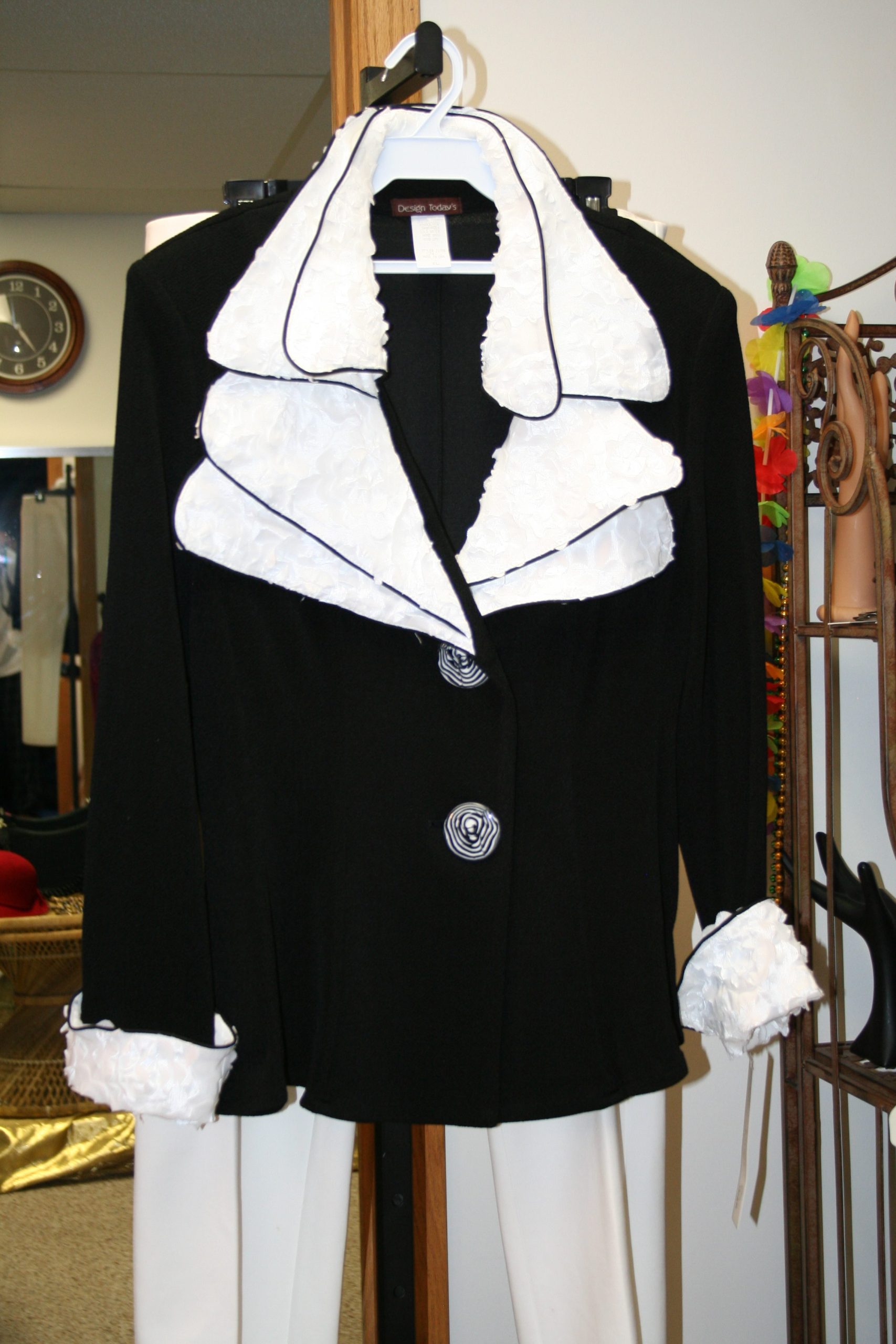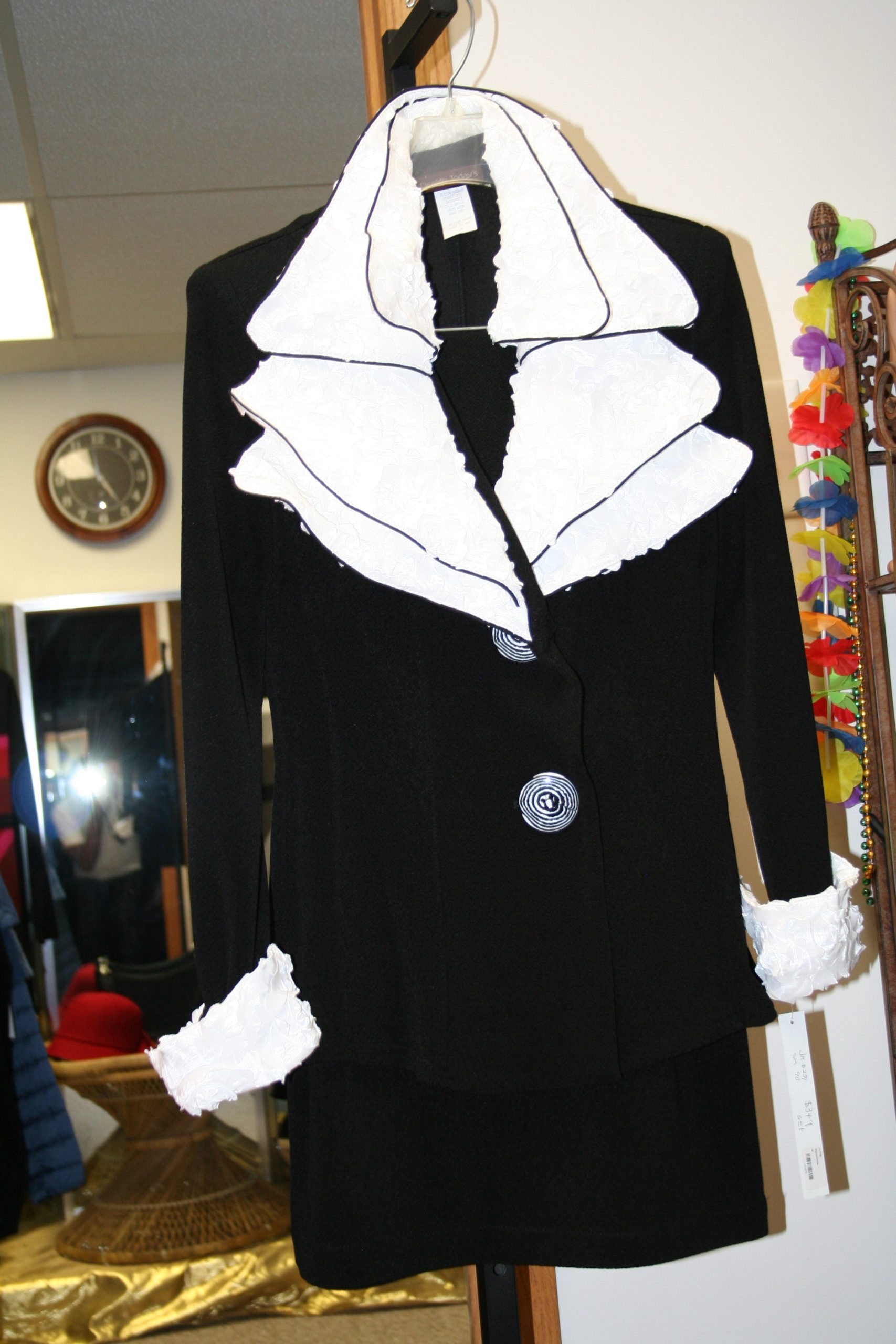 Our youthful cut. Acetate with a touch of spandex. A true beauty in black with white trim around the adjustable double collar and cuffs. Comes with a matching skirt or pant in black. Also beautiful with a white slack.
